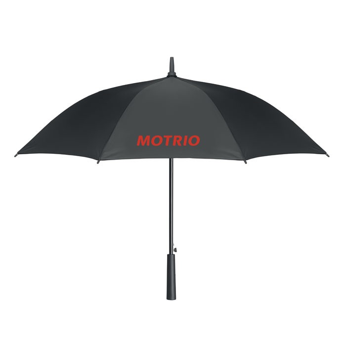 Parapluie tempête 23 pouces à ouverture automatique en pongee 190T avec mât en fibre de verre, manche plaqué noir et embouts en plastique. Poignée en ABS avec finition en caoutchouc. Fermeture manuelle.